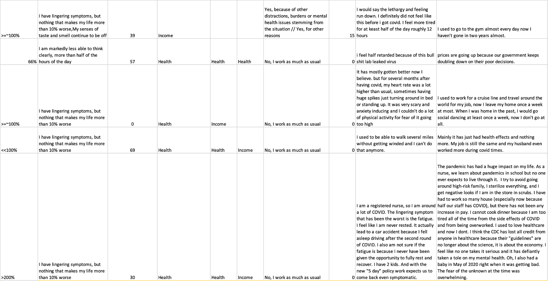 There are only nine cases of long covid from more than two months ago, and I asked people a few different things about them, so it seems easier to tell you their answers than to try to summarize, especially because I think it’s helpful to see all of a person’s answers together: